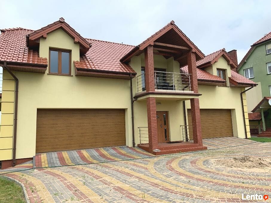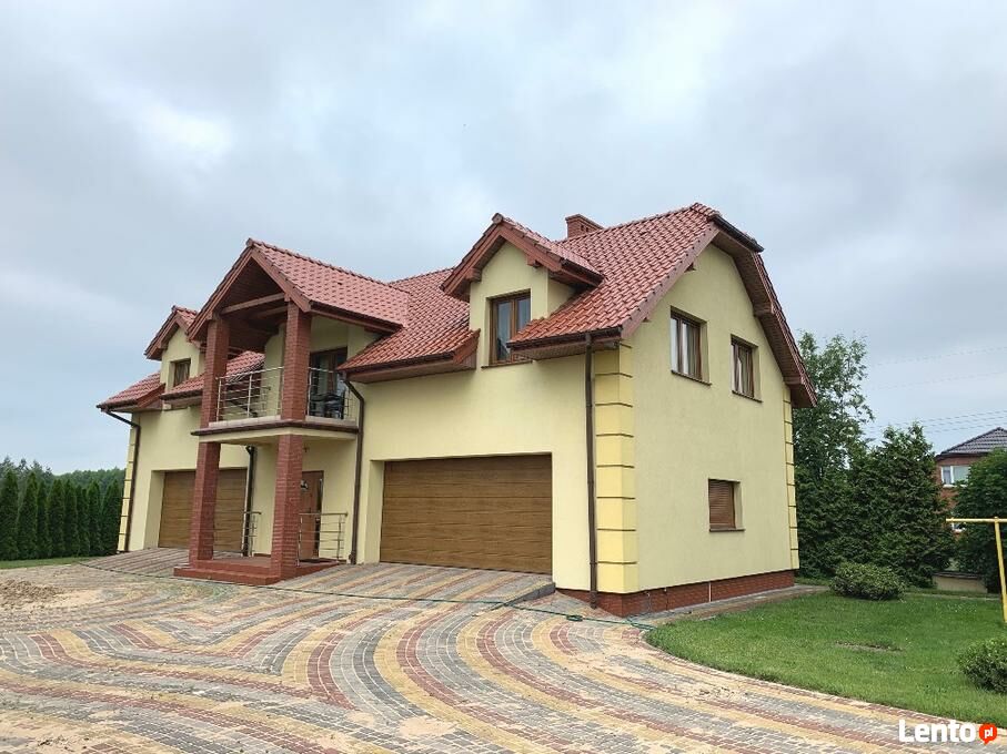 Budynek mieszkalny w zabudowie wolnostojącej, piętrowy, z dwoma garażami dwustanowiskowymi na poziomie parteru. Budynek nowy, jeszcze nie zamieszkały, wybudowany w 2014 roku. Mury z cegły, ocieplone styropianem grubości 15 cm, otynkowane i pomalowane. Powierzchnia budynku łącznie z garażami wynosi ok. 300 m2, na którą to składa się: duży salon z aneksem kuchennym, 2 sypialnie, duża łazienka, kotłownia na poziomie garaży. Stolarka okienna PCV. Dach konstrukcji drewnianej pokryty dachówką ceramiczną Roben. Ogrzewanie centralne na ekogroszek – piec z komputerem z płaszczem wodnym.